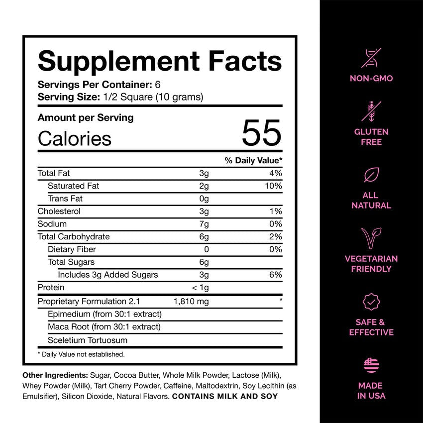 Crafted with premium white chocolate, infused with cherry, rose, and oat milk, this vegetarian and gluten-free treat blends indulgence with function. Each square contains a powerful mix of natural ingredients like Maca Root, Epimedium, Kanna, and Cocoa, working together to enhance desire, boost blood flow, and promote relaxation—without pharmaceuticals.