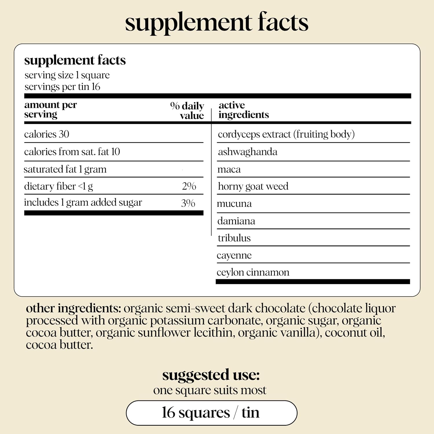 Why This Becomes a Wellness Ritual You Crave • Elevates Mood & Confidence — adaptogens and nootropics support emotional balance and sensual connection • Natural, Steady Energy — cordyceps + maca enhance vitality without caffeine or crashes • Premium, Plant-Based Ingredients — organic dark chocolate and herbal superfoods, never fillers • Clean-Lifestyle Friendly — vegan, gluten-free, dairy-free, kosher, and fair-trade • Perfect for Daily Joy & Special Moments — enjoy as a relaxing ritual or intimate boost